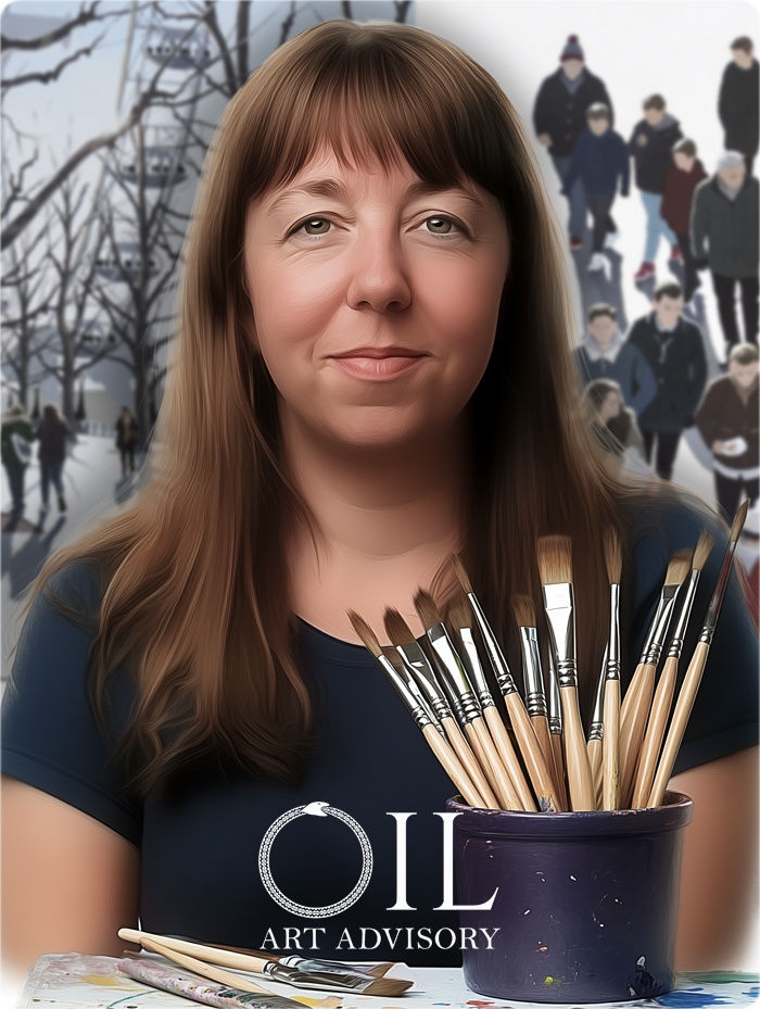 Jo Quigley is a British painter living near Woking in Surrey. With a background in Fine Art—holding a BA from Winchester School of Art and a master's degree from Kingston University—she transitioned from a decade-long teaching career to painting full-time in her home studio. Her work is inspired by the dynamic energy of urban life, particularly scenes observed in and around London. Her paintings often feature people going about their day, capturing the fleeting moments of movement, sunlight, and shadow that define life in the city.